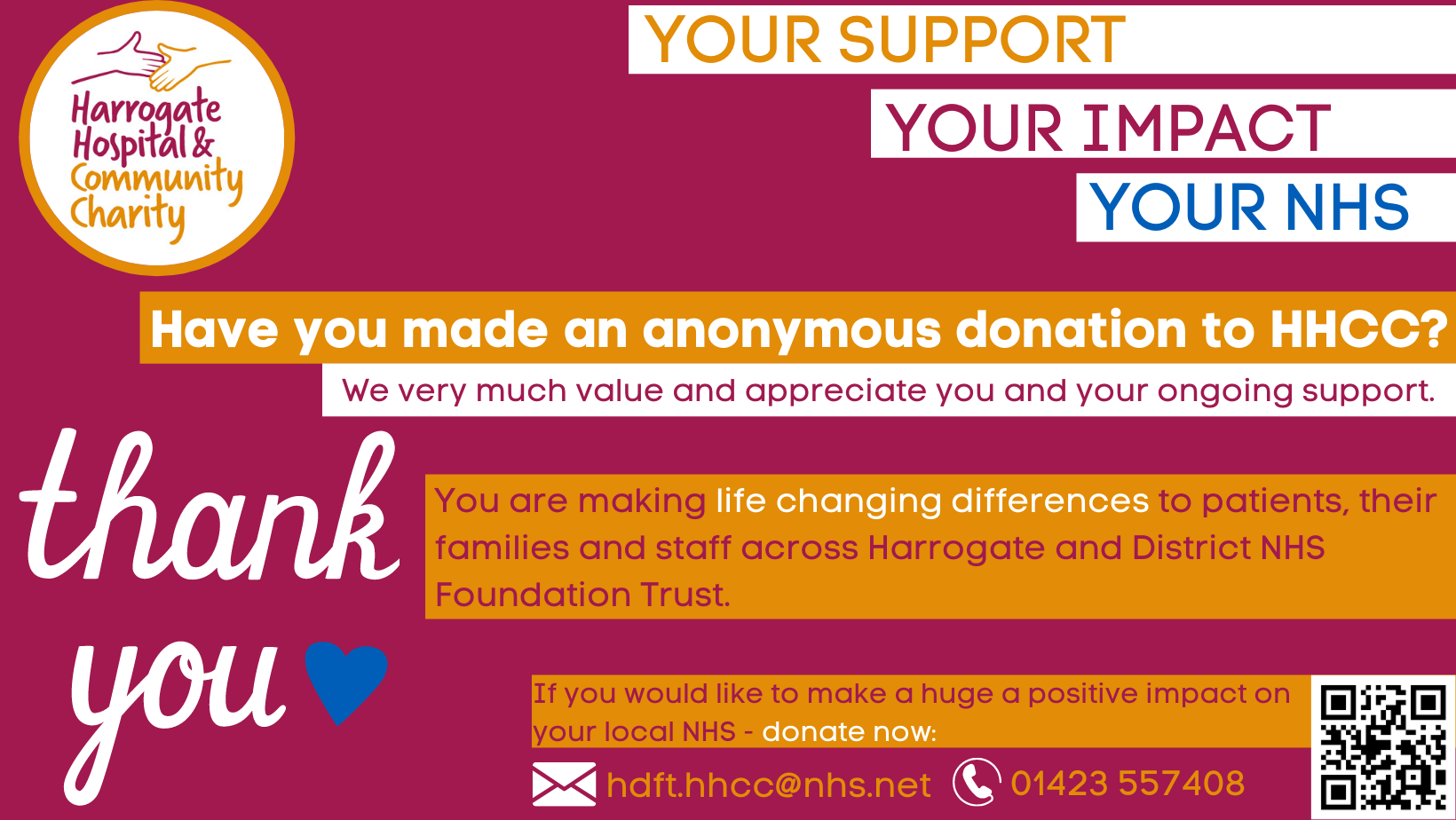 If you have donated to HHCC by BACS/Bank Transfer, please let the Team know by emailing hdft.hhcc@nhs.net.